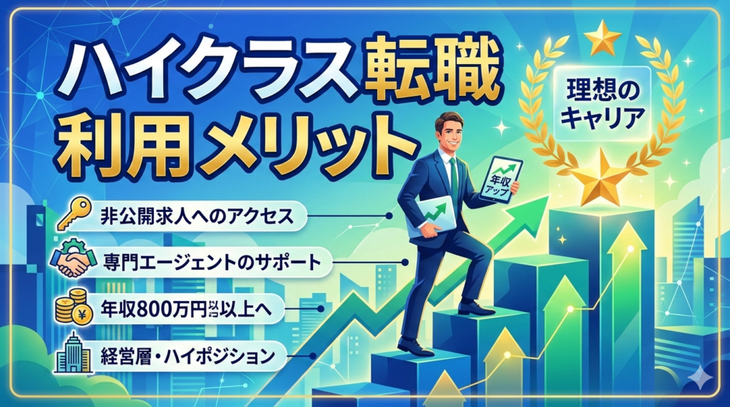 ハイクラス転職サービスを利用するメリット完全ガイド|年収800万円以上のキャリアアップを実現する活用術と成功のコツ【2026年最新】 ハイクラス転職サービスを利用する最大のメリットは、非公開求人へのアクセスと専門的なサポートによって、年収800万円... -