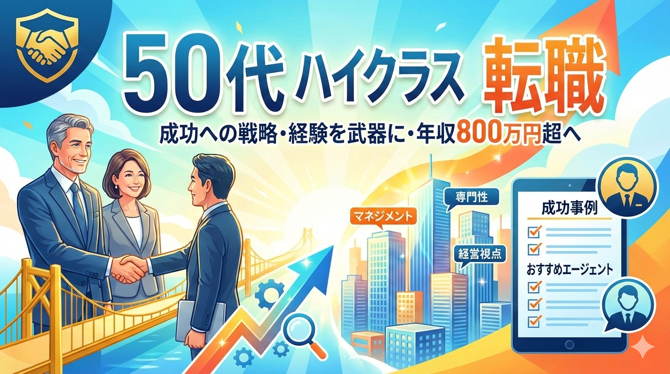 50代でもハイクラス転職は十分に実現可能です。マネジメント経験や高い専門性を武器に、年収800万円以上のポジションを勝ち取っている50代は確実に増えています。本記事では、2026年最新の転職市場データをもとに、50代がハイクラス転職を成功させるための戦略・おすすめエージェント・成功事例・注意点を徹底解説します。