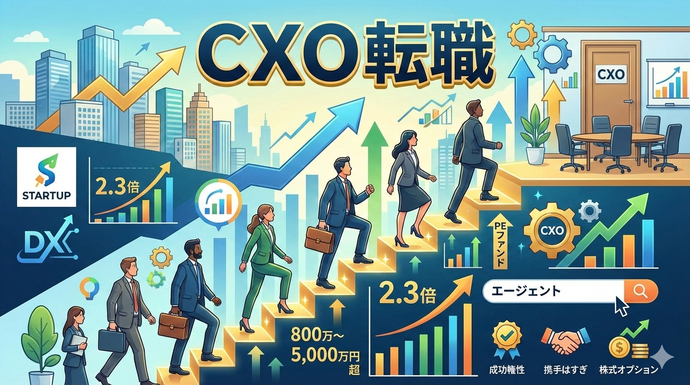 スタートアップの急成長、大企業のDX推進、PEファンド投資先の経営人材ニーズ拡大を背景に、CXOポジションの求人は右肩上がりで増え続けています。かつては「社内昇格」が主流だった経営幹部への道も、外部からのプロフェッショナル登用が当たり前の時代に変わりました。年収レンジは役職やフェーズによって大きく異なりますが、CFO・CTOクラスで1,500万〜3,000万円、CEOクラスでは3,000万〜5,000万円以上も珍しくありません。加えてストックオプションが付与されるケースでは、IPO時に数千万〜数億円規模のリターンを得る可能性もあります。CXO転職を成功させるカギは、適切なエージェント選びと、自分の強みを「経営課題の解決力」として言語化することです。