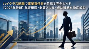 人事職のハイクラス転職においては、採用戦略の設計力や組織開発の実績が重視されます。CHRO候補やHRBPとしてのキャリアを目指す場合、経営層と連携した人材戦略の立案・実行経験が大きな武器になります。人事職のハイクラス転職完全ガイド【2026年最新】年収800万円以上を実現するエージェント活用術・キャリア戦略・成功の全手順で詳細を解説しています。