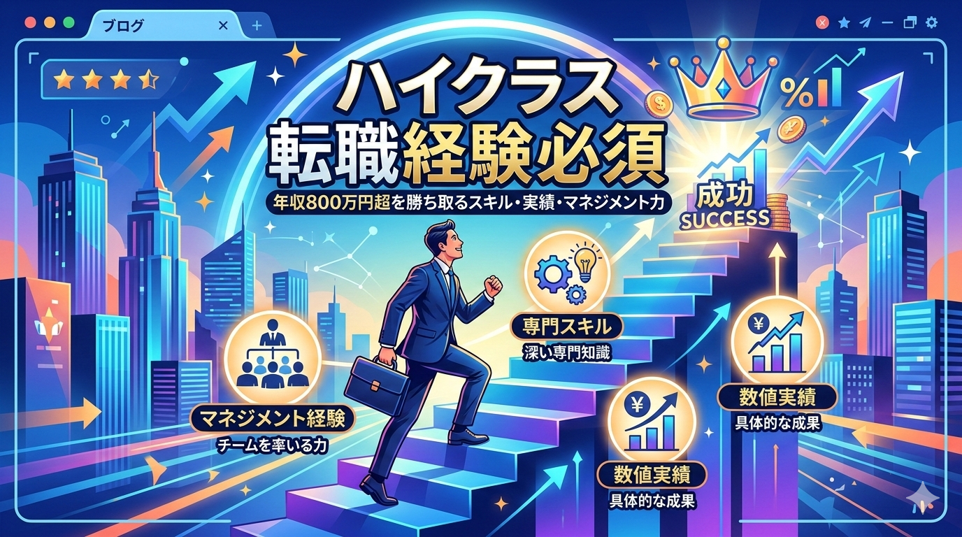 ハイクラス転職を成功させるには、マネジメント経験・高度な専門スキル・数値で語れる実績の3つが必須です。本記事では、年収800万円以上のポジションを狙う方に向けて、企業が本当に求めている経験やスキルの中身を年代別・職種別にわかりやすく解説します。あなたのキャリアを一段上に引き上げるヒントが、ここにあります。