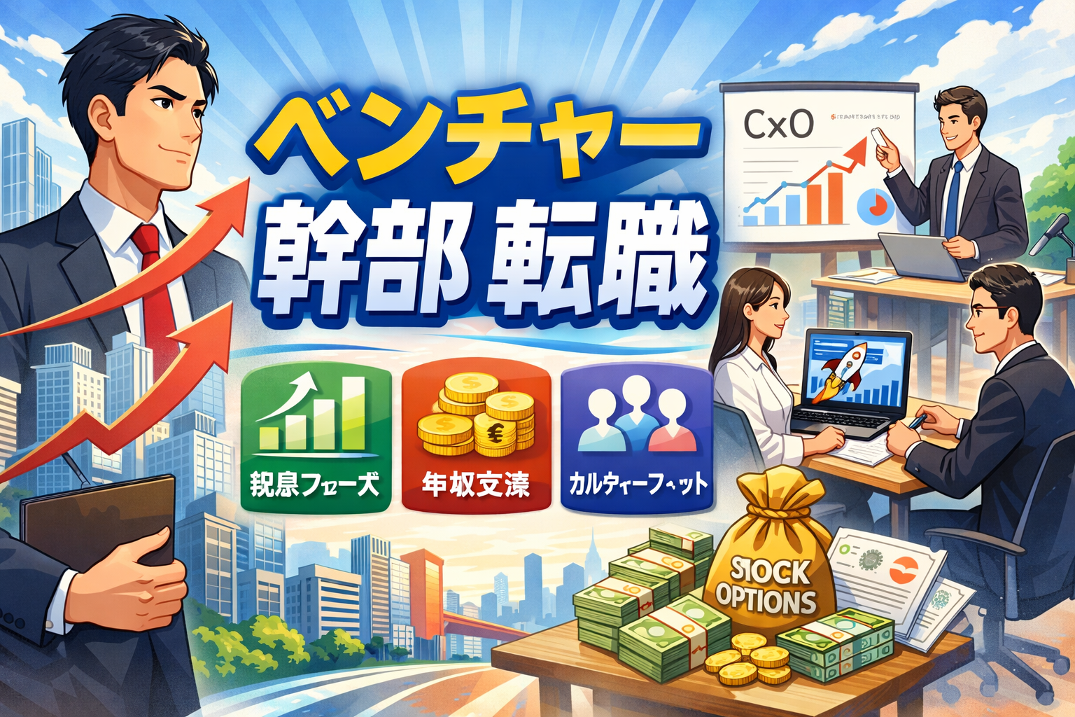 ベンチャー企業の幹部として転職を成功させるには、成長フェーズの見極め・年収交渉・カルチャーフィットの3つが鍵です。本記事では、大企業からベンチャー幹部へのキャリアチェンジを検討する方に向けて、2026年最新の市場動向、CxOポジション別の年収相場、失敗事例から学ぶ注意点、そしておすすめの転職エージェントまでを網羅的に解説します。